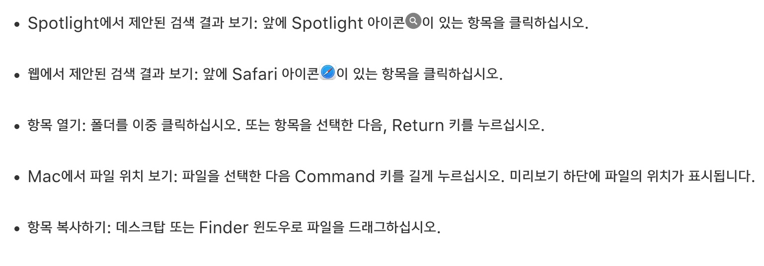 스폿라이트는 가장 연관성 높은 항목을 먼저 나열하며, 클릭해서 미리 보거나 열 수도 있다.