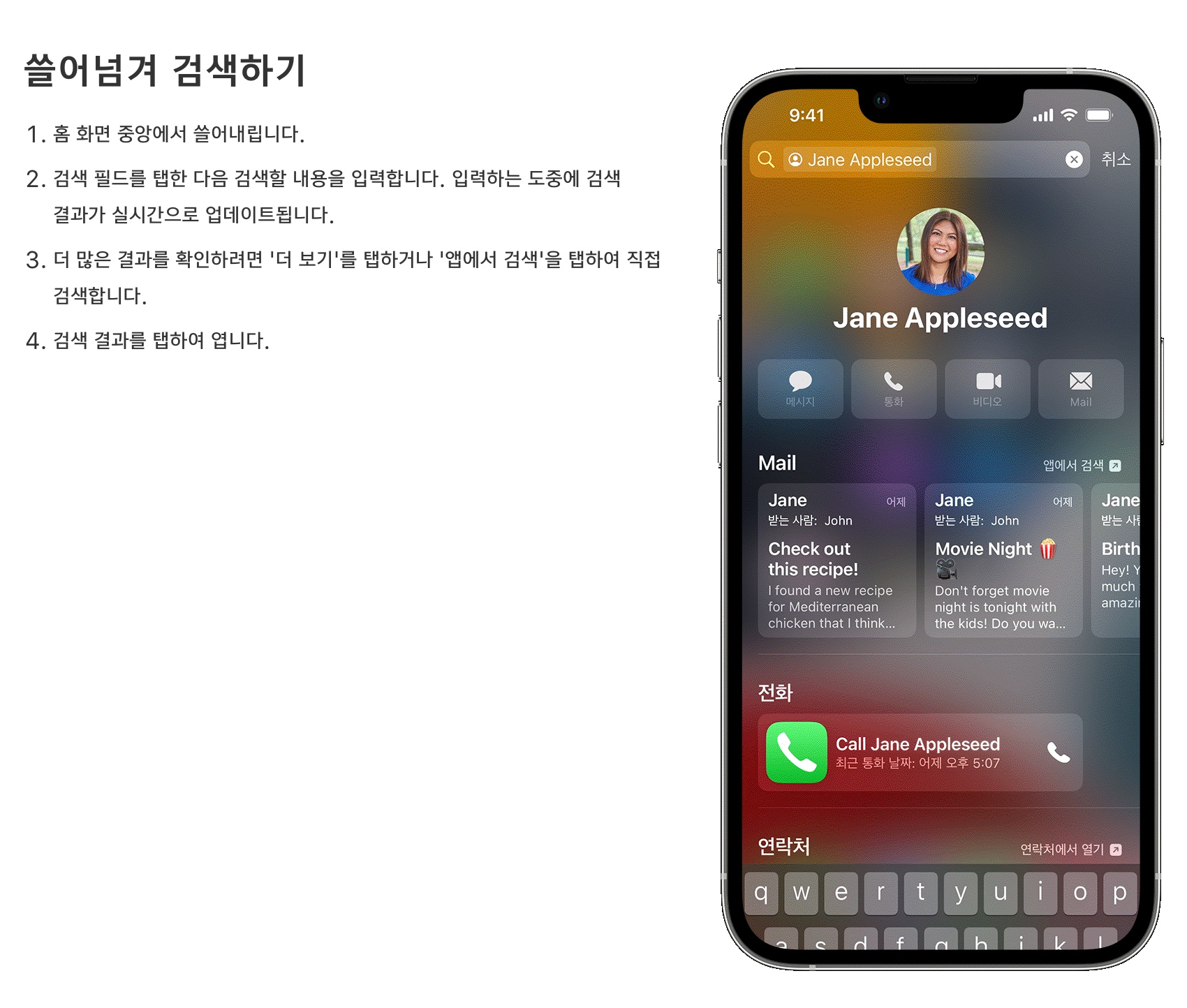 또한 사용자 검색어를 변형해 검색한 항목을 제안하며 스폿라이트 또는 웹에서 해당 결과를 볼 수도 있다.